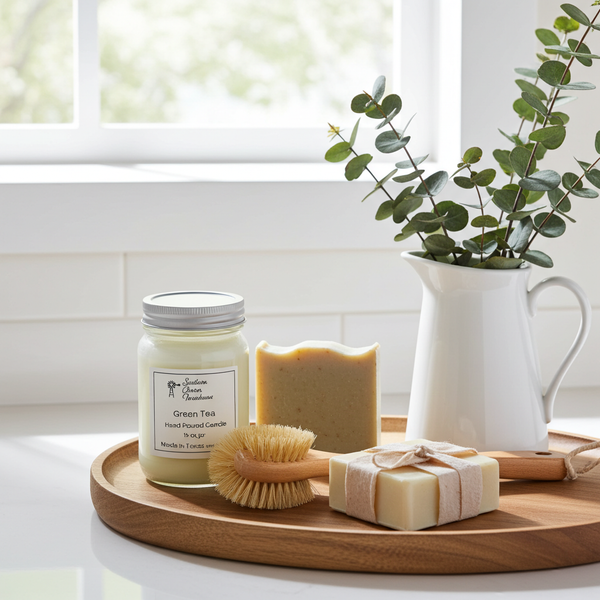 Farmhouse Tip Place this candle on a stone or marble coaster next to your favorite ceramic teapot or a stack of white tea towels. The organic, "warm green" scent pairs perfectly with natural materials, making it a beautiful addition to a minimalist farmhouse kitchen or a sun-filled breakfast nook.